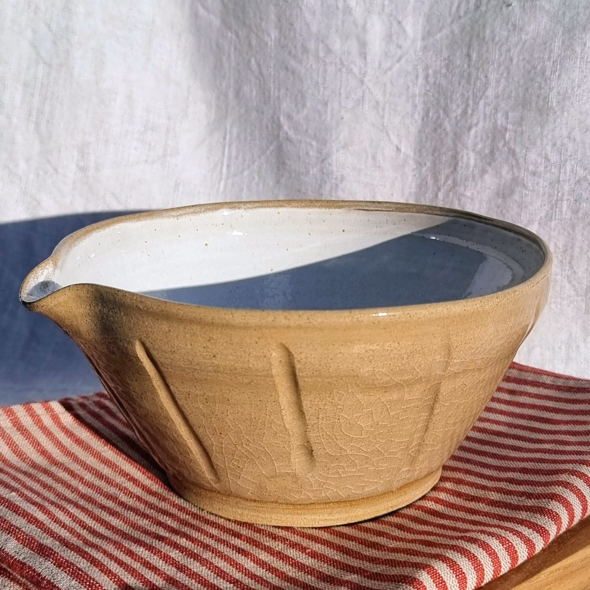 Drejad i vit stengodslera, insida glaserad vit, utsida transparent. Glest ristat mönster på utsidan.