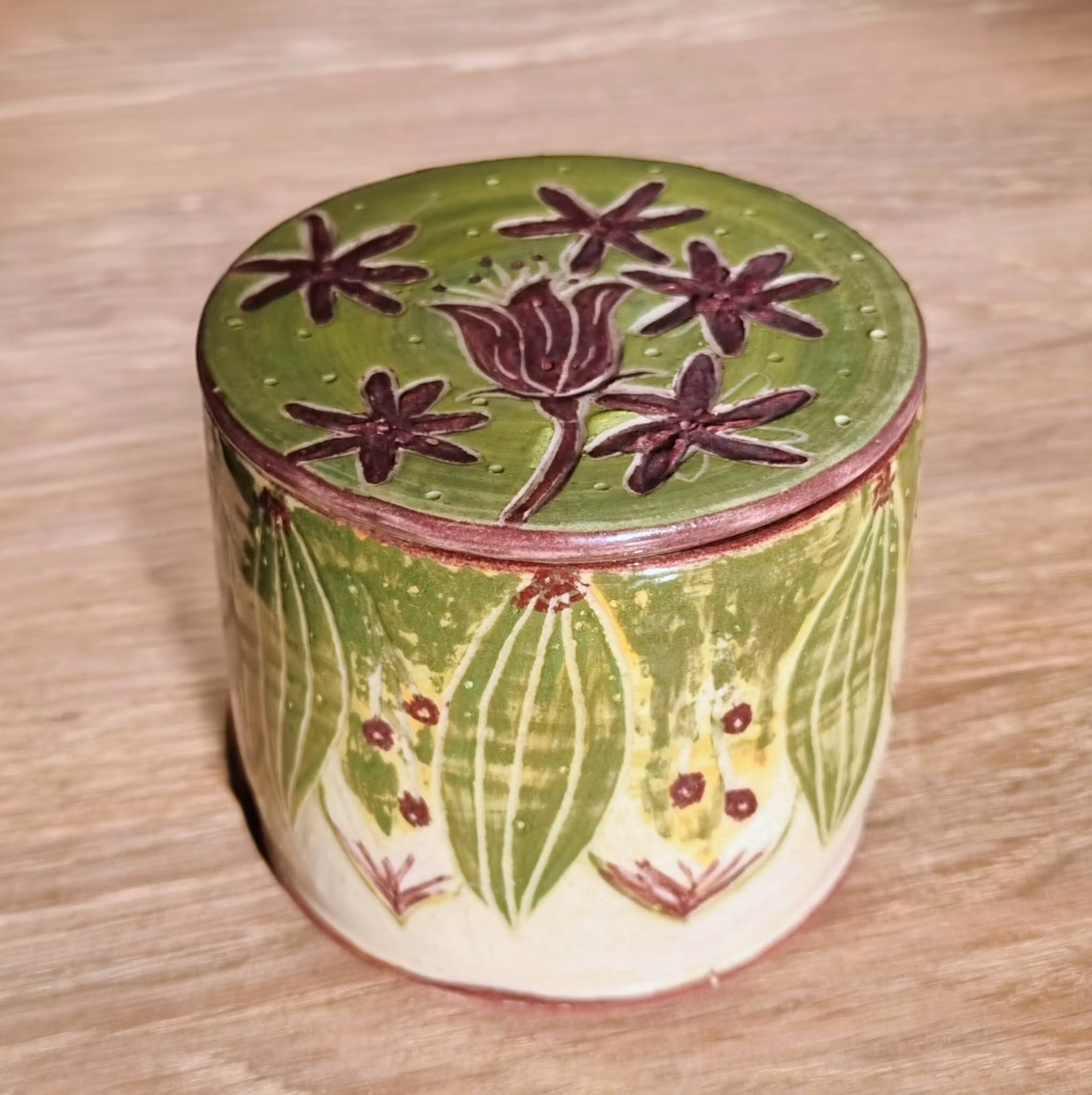 Drejad i vit stengodslera. Målat växtmotiv. Glaserad vit.