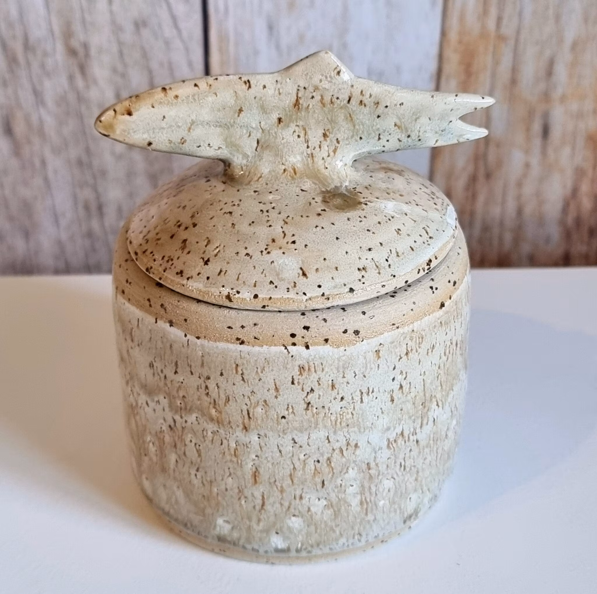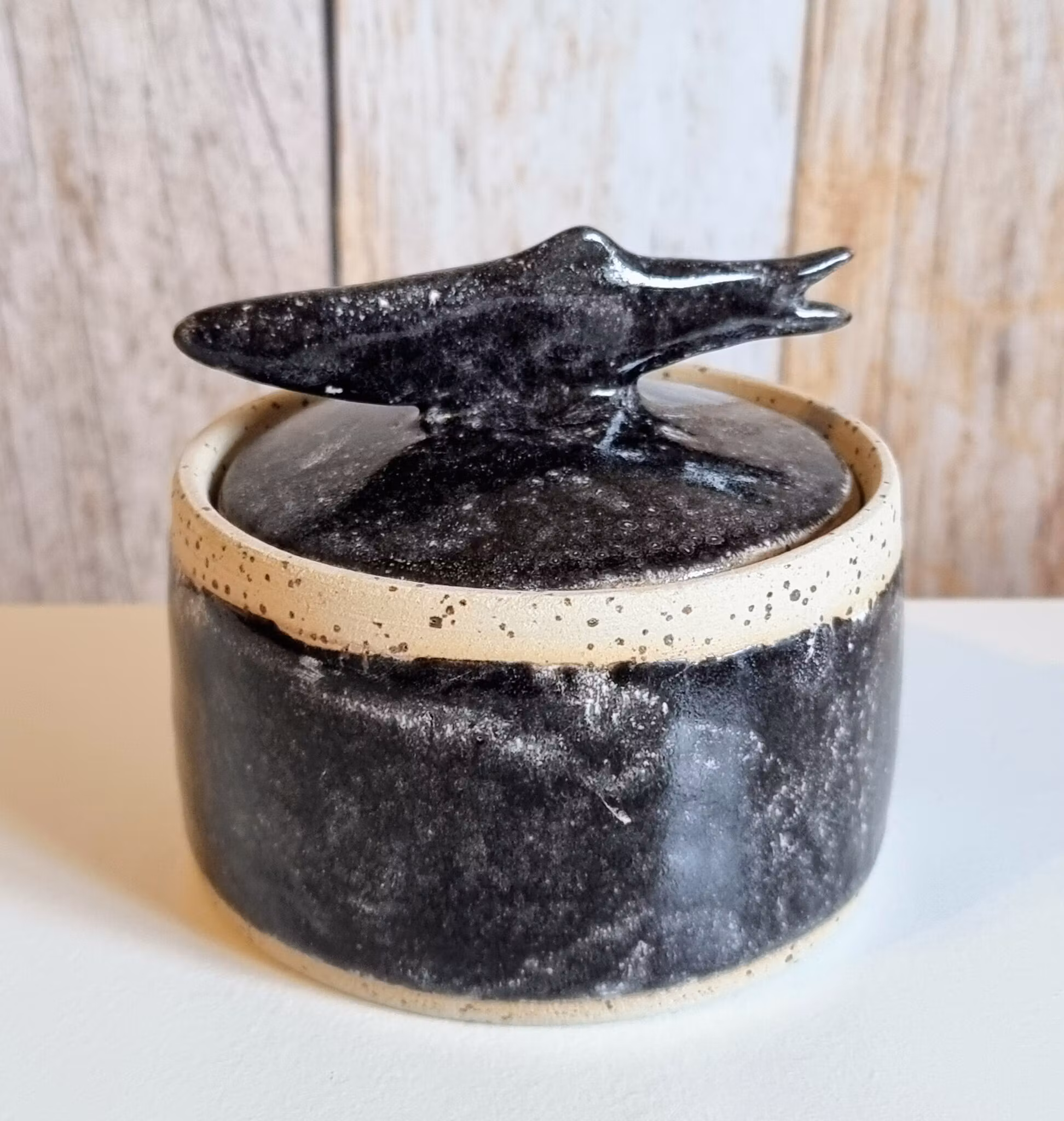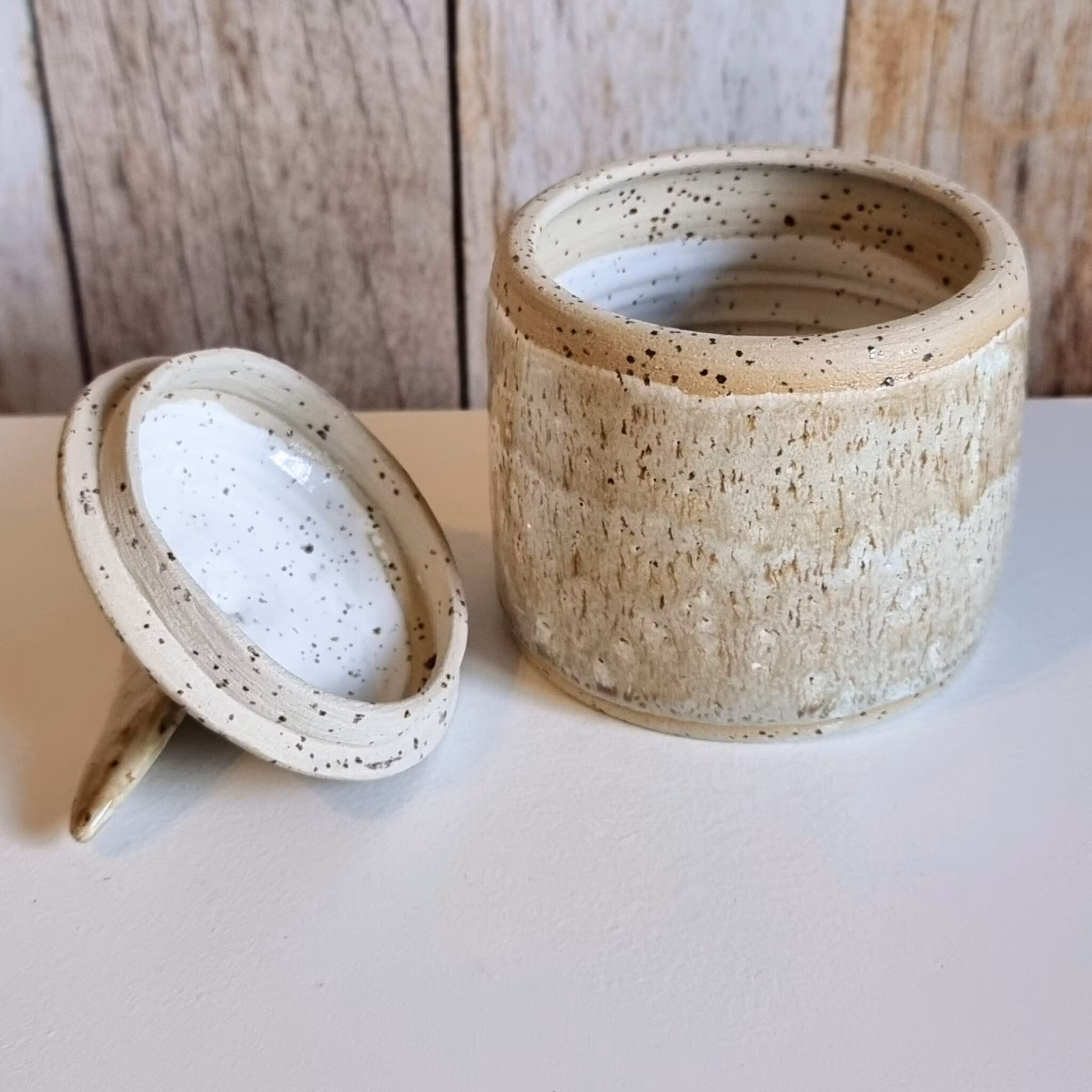 Drejad i vit stengodslera med lavaprickar. Välj mellan två olika färger/glasyrer, alt 1 svart melerad och alt 2 utsidan glaserad ljusbeige melerad och insidan vit.